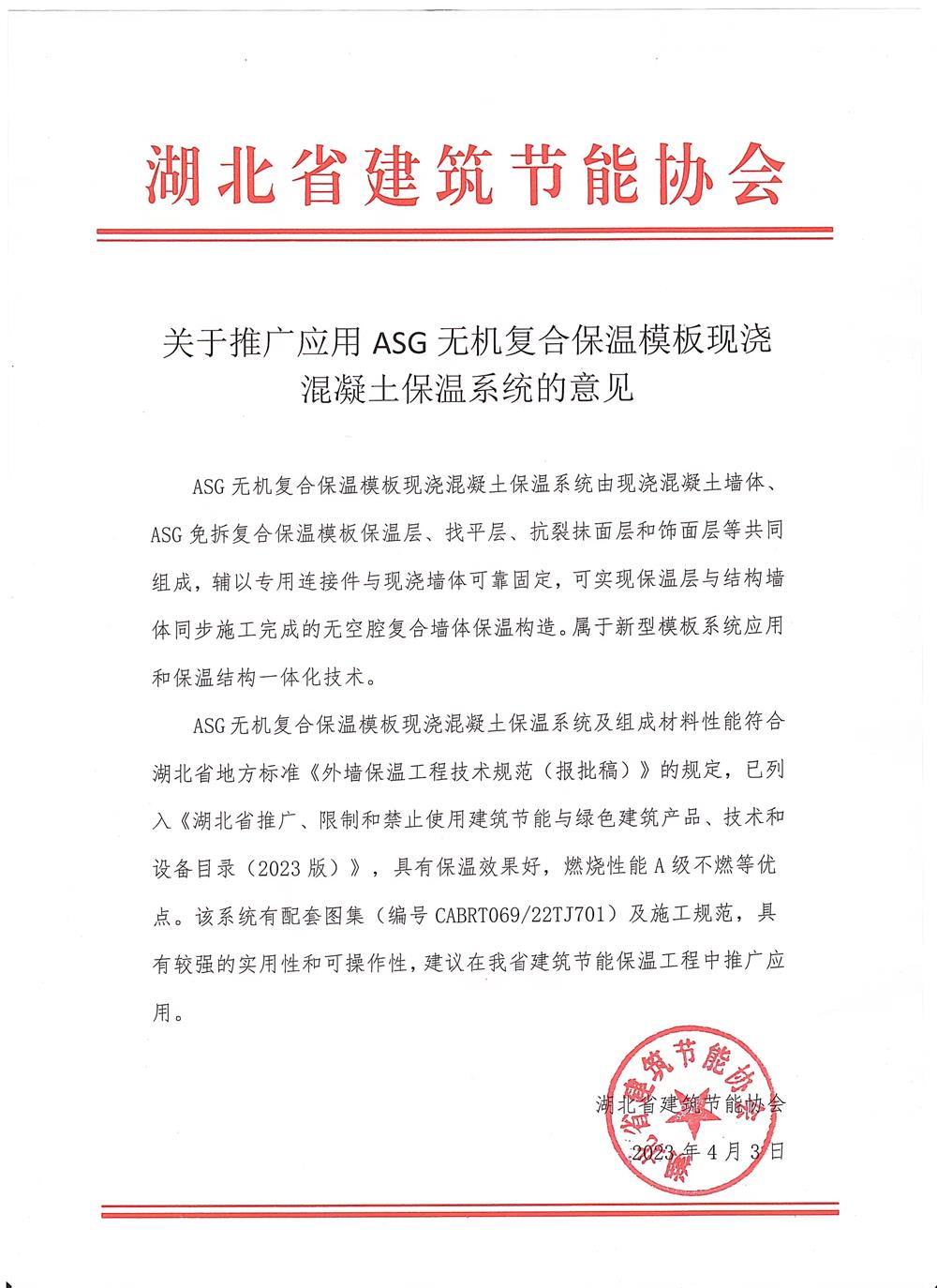 ASG無(wú)機(jī)復(fù)合保溫模板現(xiàn)澆混凝土保溫系統(tǒng)及組成材料性能符合湖北省地方標(biāo)準(zhǔn)《外墻保溫工程技術(shù)規(guī)范(報(bào)批稿)》的規(guī)定,已列入《湖北省推廣、限制和禁止使用建筑節(jié)能與綠色建筑產(chǎn)品、技術(shù)和設(shè)備目錄(2023版)》,具有保溫效果好,燃燒性能A級(jí)不燃等優(yōu)點(diǎn)。該系統(tǒng)有配套圖集(編號(hào)CABRT069/22TJ701)及施工規(guī)范,具有較強(qiáng)的實(shí)用性和可操作性,建議在我省建筑節(jié)能保溫工程中推廣應(yīng)用。